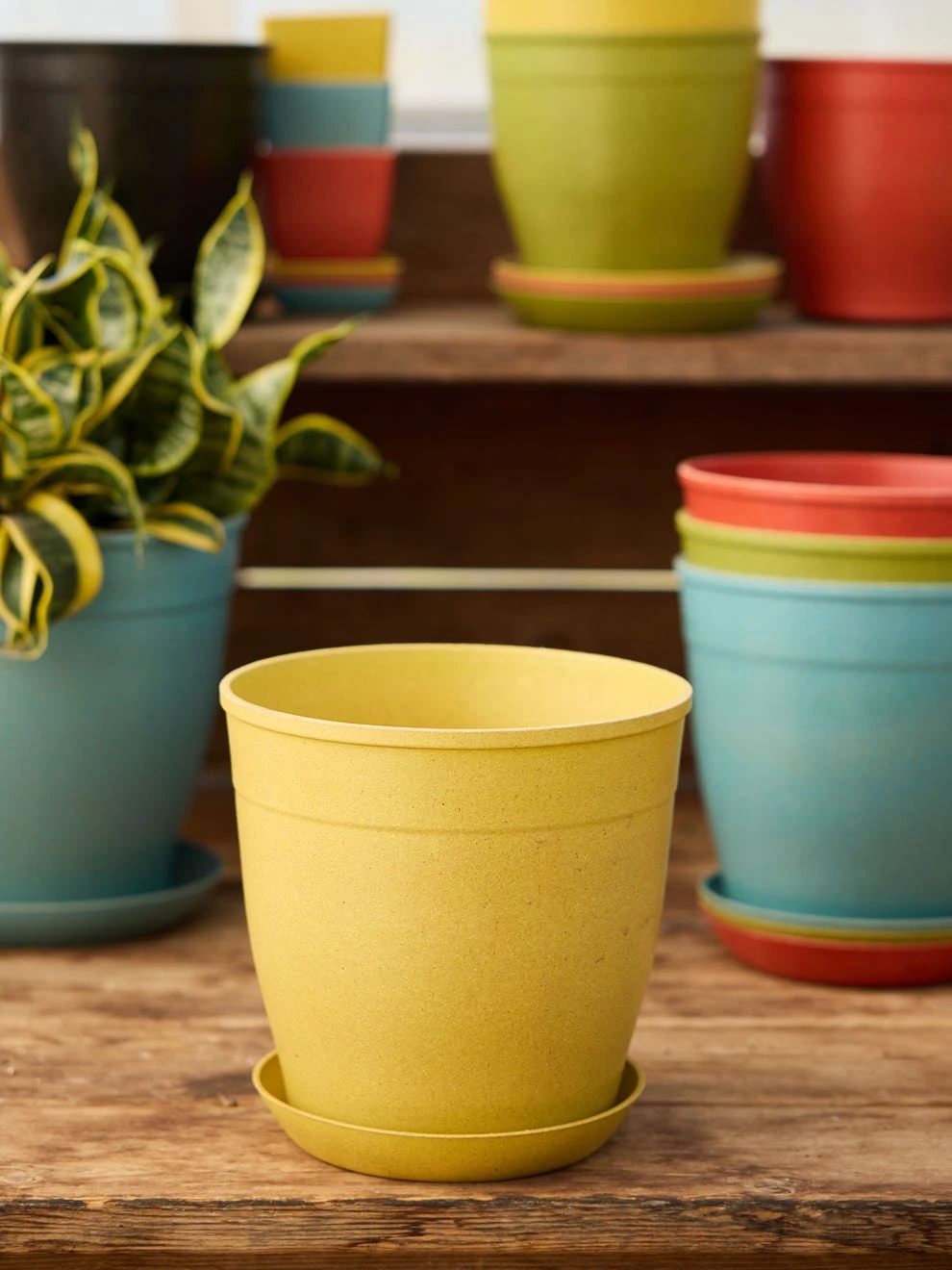 These eco-friendly 8-inch pots with saucers are made from rice hulls, a sustainable material that breaks down in community compost systems. They are lightweight and attractive, and come in five colors to match any plant. They are designed to last five years outdoors, and even longer indoors.