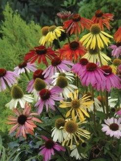 Our blend of the full spectrum of echinacea colors and bloom types brings divine color harmony to the garden. We’ve included several different species so that you get bursts of pink, purple, wine, yellow, cream and orange. A range of delightful bloom forms, too, some with full upright petals and others displaying spooned or recurved petals. Makes for a carnival of color, ideal as a backdrop for a mass planting of purple petunias or pink vinca.