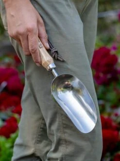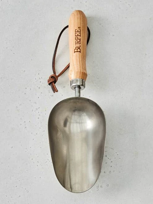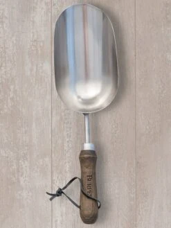Ideal for fast removal of potting mixes or compost. Allows for speedy work as it picks up large measures with every load. Designed with a high back that keeps your favorite planting mixes in place. Our polished stainless steel finish is highly resistant to rust with a sturdy leather cord for easy storage. Measures: 13″ long including 5″ oak wood handle. 10 year Warranty.