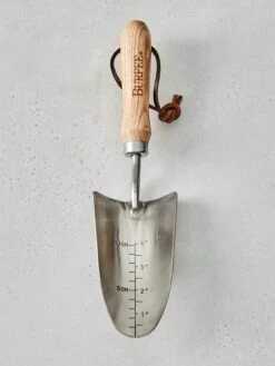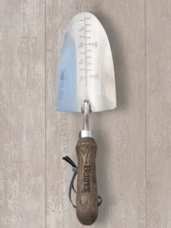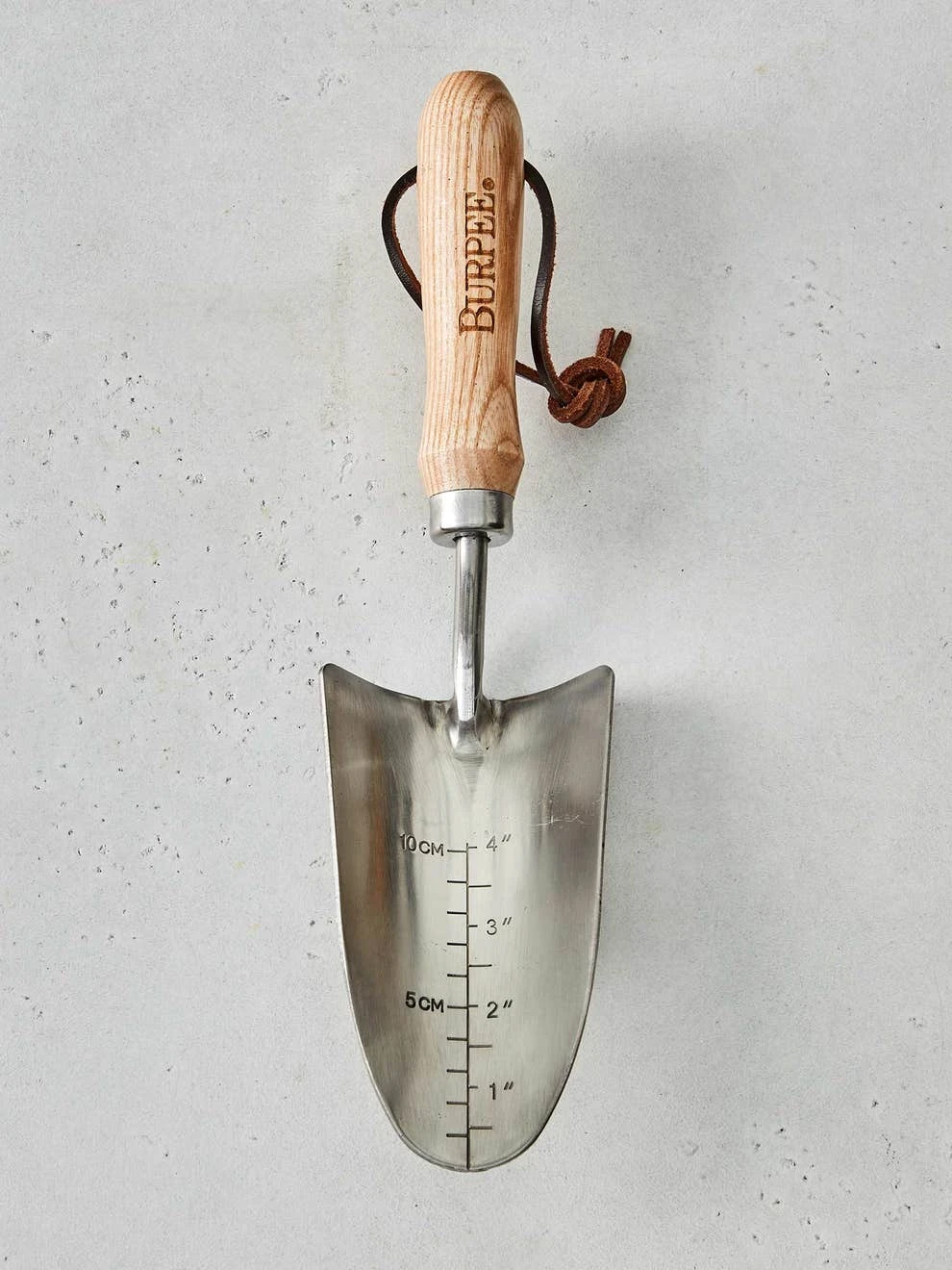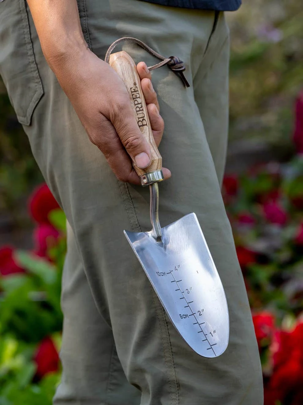 Our garden trowel is made for durability and strength. Balanced to reduce the effort and stress of planting. Trowel features large scoop shovel and solid stainless steel construction with oak wood handle and leather hang strap. Part of our Burpee line of high quality, long-lasting tools. Measures 13” long including 5” handle. 10 year Guarantee.