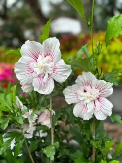 From the rounded, bushy habit to the fluffy doubled center to the magenta firework brush strokes, ‘Starblast Chiffon’ makes an indelible impression. The dramatic display of red-veined white flowers with double centers begins earlier and carries on longer than most hibiscus cousins. Heat-tolerant and deer-resistant.