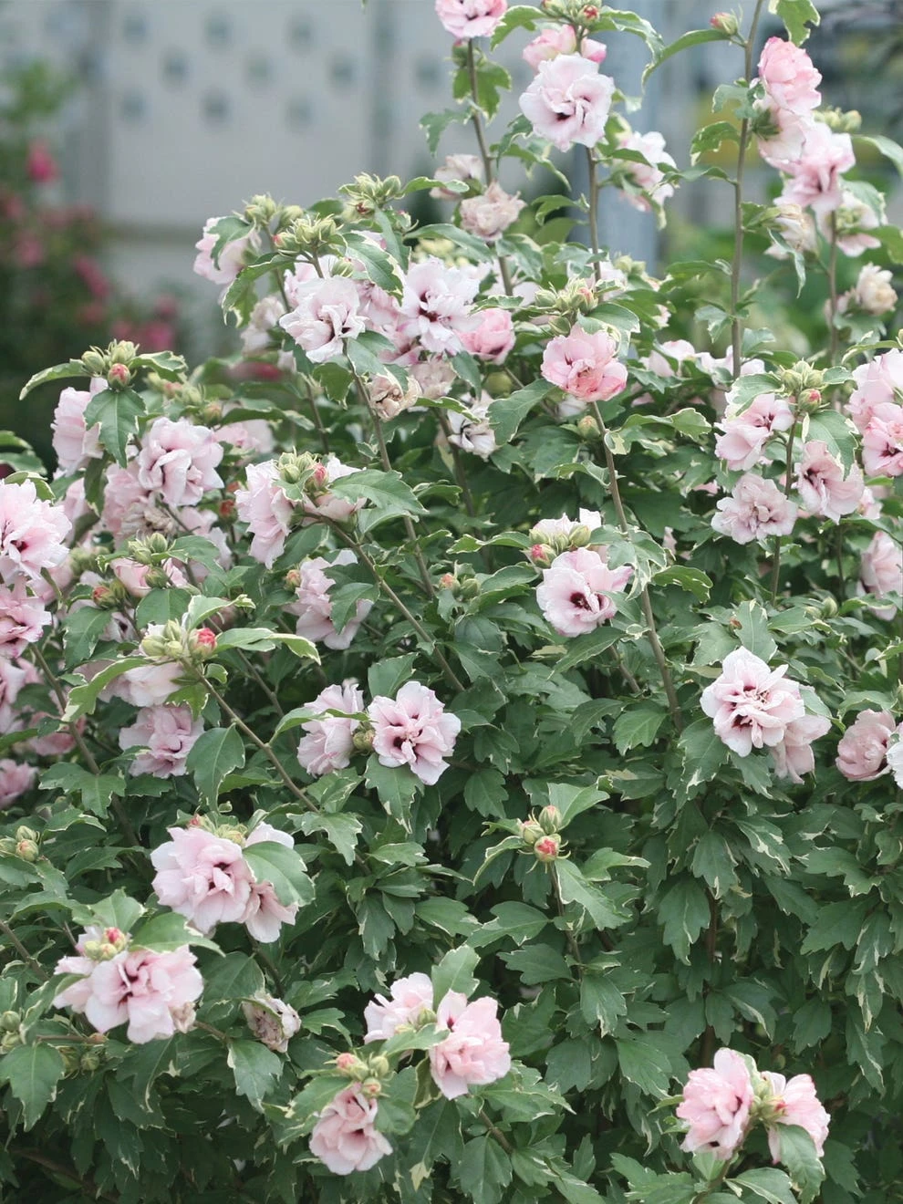 Cheery semi-dwarf hibiscus produces a riot of ruffled soft pink double blooms, complemented by variegated deep blue-green and creamy white foliage. Makes a bold statement in the perennial border from early to late summer. Attracts a loyal crowd of hummingbirds and butterflies. Plants won’t set seed. Proven Winners USPP20579.