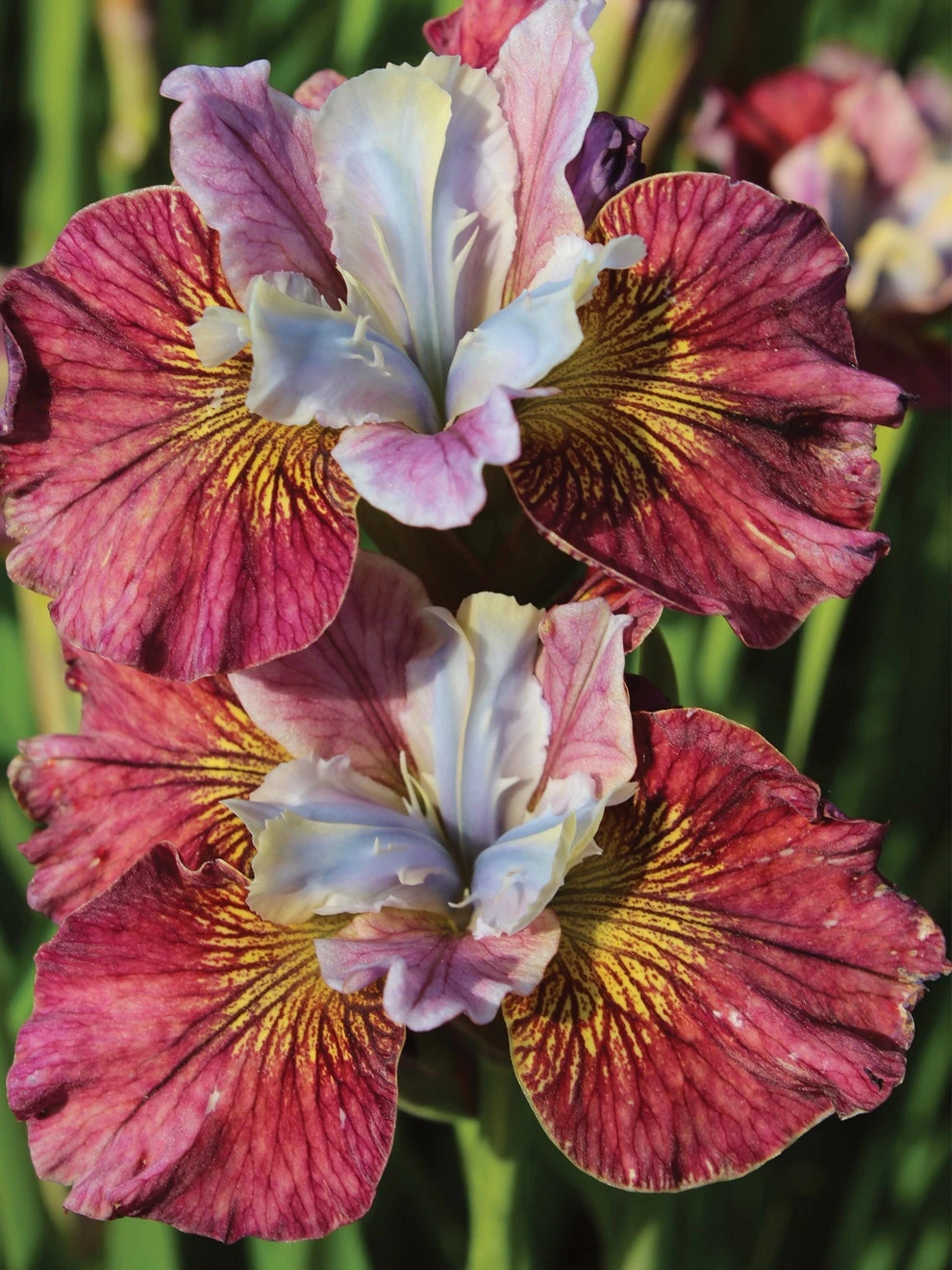 Bold and beautiful in remarkable color combinations, ‘Painted Woman’ is a must-have Siberian iris. Rich shades of red-rose intermingle with gold, against pearl-colored upright standard petals. Pick some to add pizzazz to bouquets! Easy to grow and care for, iris is a staple of perennial gardens, providing verticality with its grass-like leaves even when not in bloom.