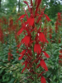 The lovely native cardinal flower forms brilliant spikes in incandescent scarlet-red. Large, lovely bird-like florets cover 36″ tall spikes like butterfly wings.