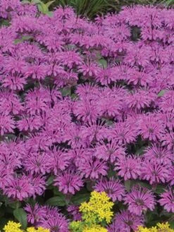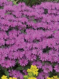 ‘Leading Lady Plum’ is a step ahead, blooming in early summer, well ahead of other bee balms. Forming smaller clumps than your average bee balm, this compact, low-growing 10-14” tall cultivar blooms right into midsummer. Bravura lilac-purple blossoms held by purple bracts float over densely branched plants with alluring, aromatic, dark-green foliage. Flower petals are prettily sprinkled with dark purple spots. Plants deliver two successions of blooms: once the first bloom begins to fade out, a new show of flowers grows above the first flowers. Great in the landscape or creating drama in a patio container. A surefire hit with frequent-flying butterflies, hummingbirds, and honeybees. Moderate tolerance to powdery mildew. Proven Winners USPP26447.