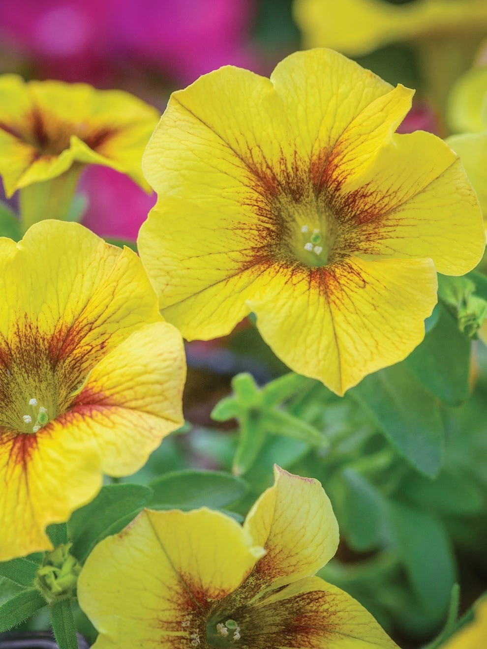 Florific cross is a double delight: artfully combining petunia’s big blooms with the vibrant, iridescent colors of calibrachoa. ‘Caramel Yellow’ sets the border aglow all summer, with a crowd of shining golden flowers with coppery-red centers. Compact 14–20″ plants are unphased by heat, cold and rain. Pleasing in hanging baskets and containers.
