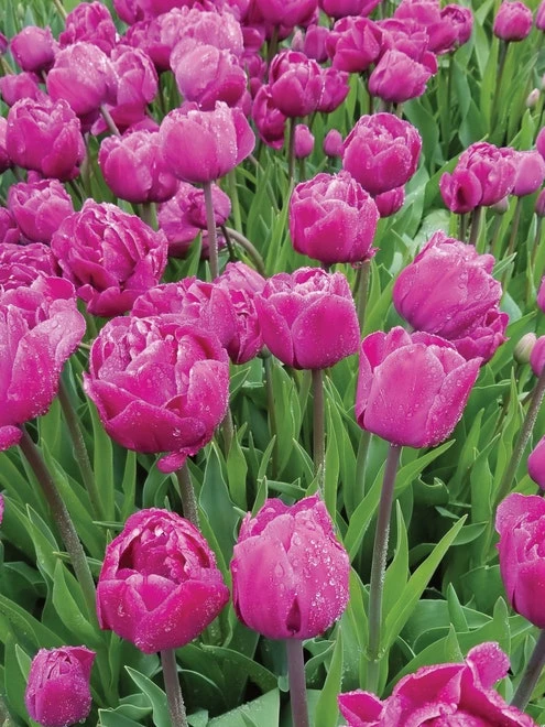 Magnificent and extraordinary, ‘Backpacker’ charms and hypnotize us with its large, double purple peony-like flowers. Selected for its durability in the vase this double-late variety will stay pretty for at least three weeks on your kitchen table. One of the best qualities for why we selected this specimen is because it is not dropping petals on the table; even when the blooms are completely spent the petals remain on the stems. Double-late group, bulb size 12 cm.
