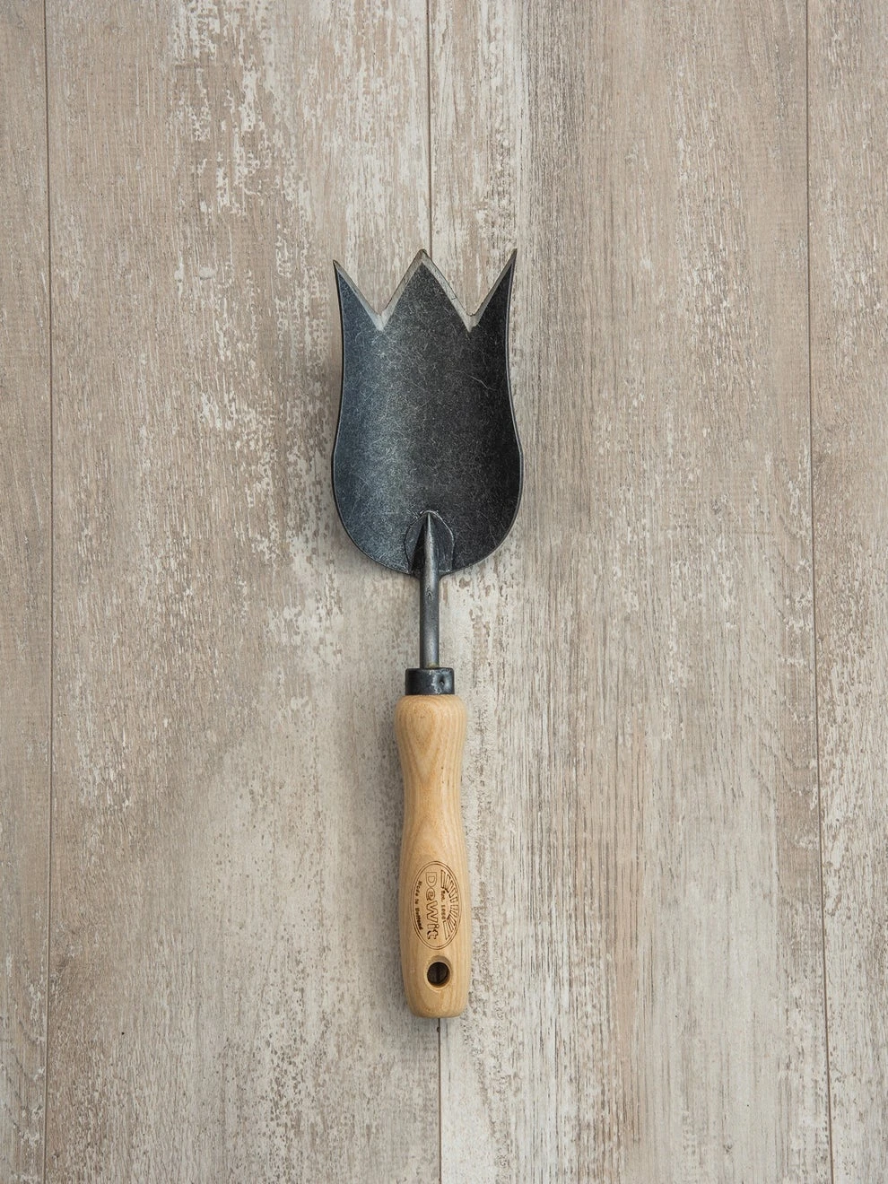 Stunning Tulip Trowel is designed for planting and transplanting small plants. Three sharpened points are able to slice into soil and cut through plant roots, and elegant curvature of blade is ideal for scooping soil – works like a trowel but breaks up soil like a fork! Excellent for clay soils. Made with boron steel and ash shock-resistant hardwood handle. Guaranteed a lifetime, measures: Head 4.5″L X 4″W, Total Length 11″, 0.5 lbs