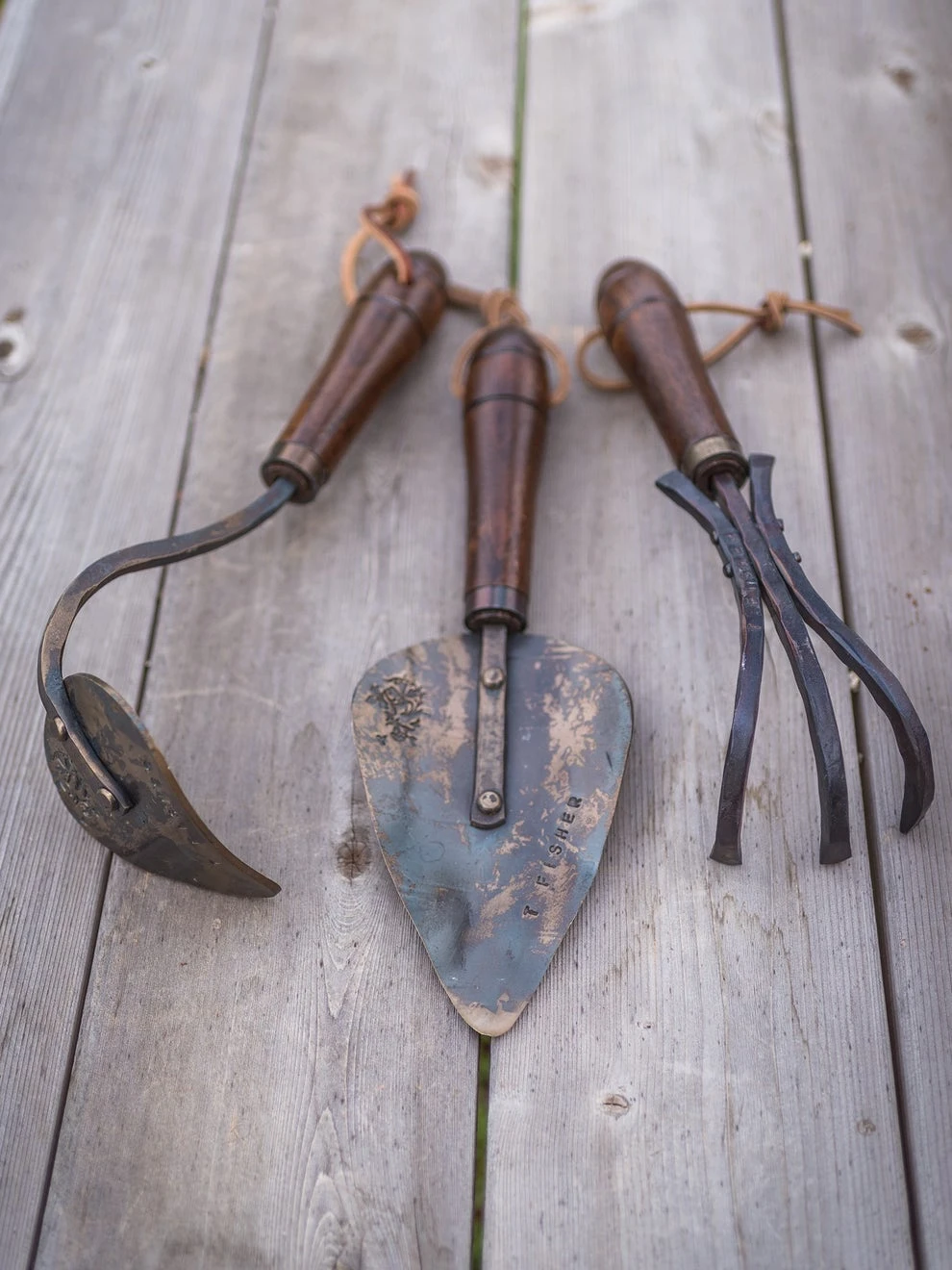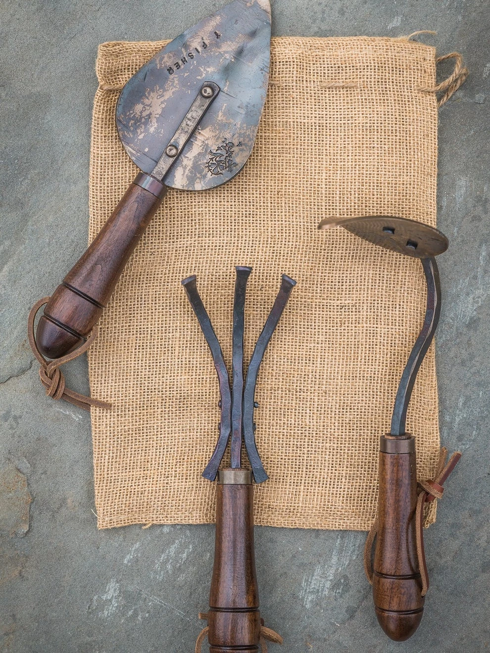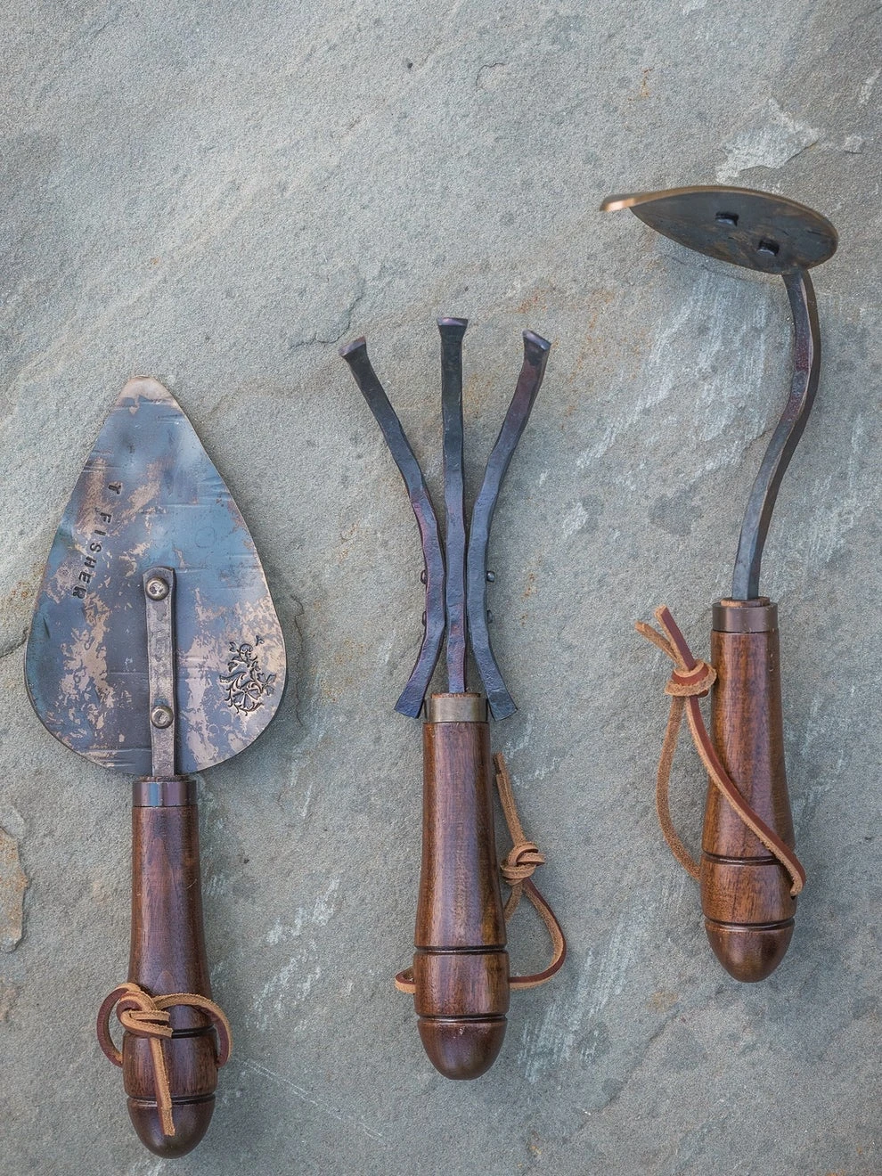 Handcrafted in Bozeman, Montana by traditional blacksmith Tuli Fisher, these garden tools are an example of fine American Craft. Steel is heated to a red glow in the forge and then shaped over the anvil with a hammer. All joinery is done using solid steel rivets. Hand-forged steel set into a black walnut handle makes these tools the ideal gift for the discriminating gardener, wedding couple, or anyone (that includes you!) who has an eye for high-quality traditional crafts and a passion for gardening.