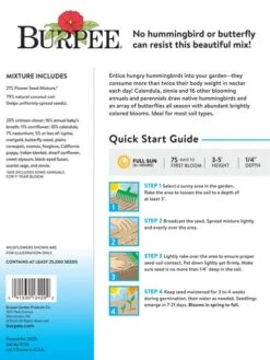 The best way to help pollinators is to diversify your garden or landscape. Use as many different plants as your landscape and aesthetic will allow in as many places as possible. Because many flowering plants typically have a brief but specific flowering time, offering a range of plants may provide needed sustenance spring, summer and fall. Like dinner guests, different pollinators have different tastes: offer a buffet that has something for everyone. Mix up flower color, shape, habit and scents. Easy to sow flower mix of annual and perennial flowers. Mix contains Butterfly Milkweed, Calendula, Cornflower, Plains Coreopsis, Cosmos, Foxglove , California poppy, Perennial Gaillardia, Annual Babys Breath, Dwarf Sunflower, Sweet alyssum, Perennial Lupine, Black Eyed Susan, Scarlet Sage, African Marigold, Crimson Clover, Nasturtium, and Zinnia. This mix covers 1000 sq ft.