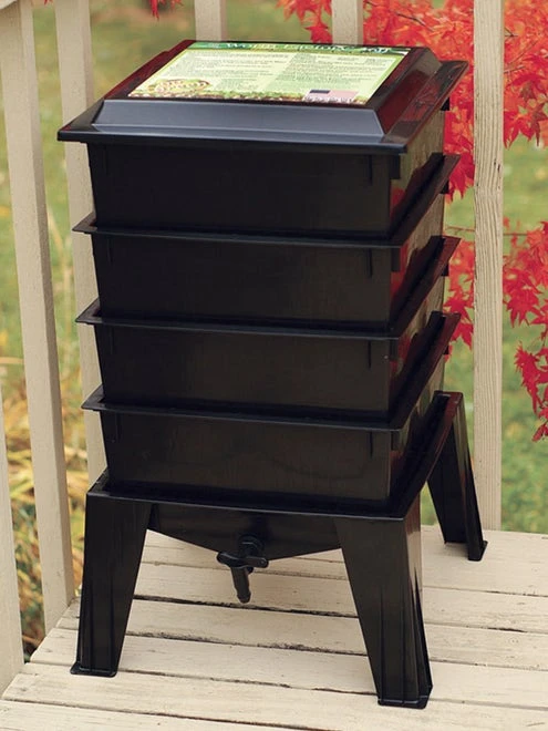 Add worms to this unique composter and watch them work for you to create rich compost that your plants love. Design allows worms to travel up into the higher tray and break down your kitchen food and paper scraps. As each tray gets digested, add new food into the higher trays, and continue cycling the trays to make more compost. Depending on the mix that is recycled, a tray could be composted in a few weeks. Apply worm castings mulch to plants throughout the growing season. Saves money on fertilizers and soil amendments.